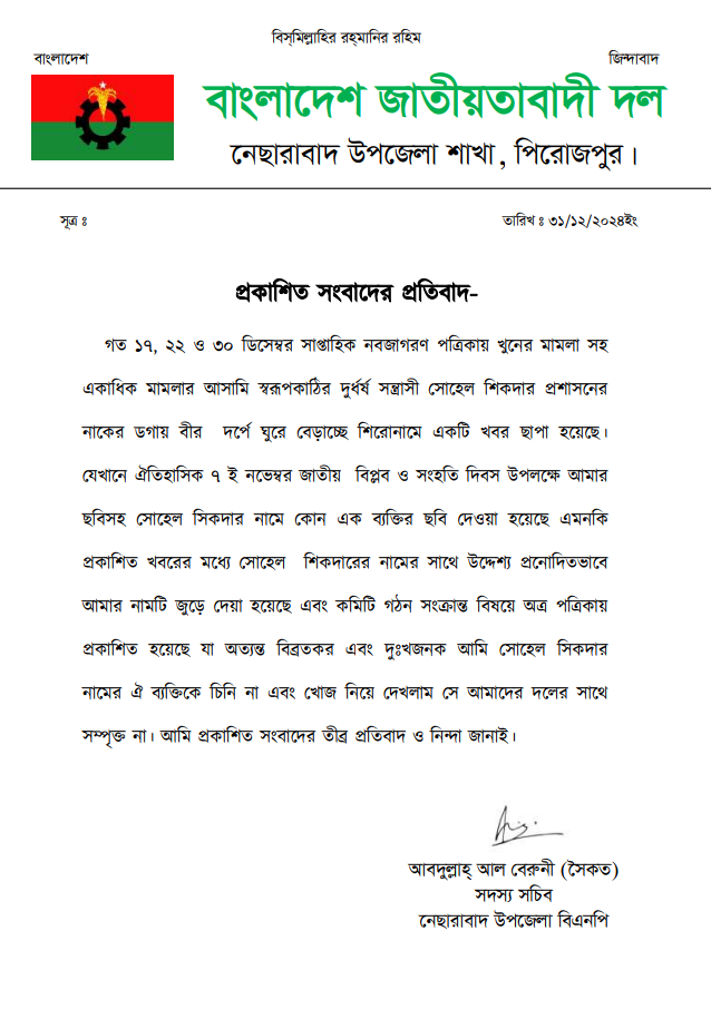 গত ১৭, ২২ ও ৩০ ডিসেম্বর ২০২৪ তারিখে জাতীয় সাপ্তাহিক নব জাগরন পত্রিকায় পিরোজপুরের নেসারাবাদ উপজেলা শাখা বিএনপি ‘র সদস্য সচিবকে জড়িয়ে যে সংবাদ প্রকাশিত হয়েছে তার তীব্র প্রতিবাদ জানিয়েছেন উপজেলা বিএনপির সদস্য সচিব আবদুল্লাহ্ আল বেরুনী (সৈকত)। ৩০ ডিসেম্বর ২০২৪ তারিখে তার স্বাক্ষরিত উক্ত প্রতিবাদ লিপিতে তিনি জানান, ৭ নভেম্বর মহান বিপ্লব ও সংহতি দিবসে তার ছবির নিচে যুবদল পরিচয় দানকারী জনৈক সোহেল শিকদার ফেইসবুকে একটি পোস্ট দিয়েছে। তিনি আরও জানান উক্ত সোহেল শিকদারকে তিনি চেনেন না। তার বিষয়ে খোঁজ নিয়ে তিনি জেনেছেন, সে বিএনপি দলের কেউ নয় বলেও তিনি প্রতিবাদ লিপিতে উল্লেখ করেন। ইহাছাড়াও সোহেল শিকদারের নামের সাথে তার নাম জুড়ে দিয়ে উদ্দেশ্য প্রনোদিতভাবে যে সংবাদ প্রকাশিত হয়েছে তা বিব্রতকর। সুতরাং প্রকাশিত সংবাদের তিনি তীব্র নিন্দা ও প্রতিবাদ জানিয়েছেন।