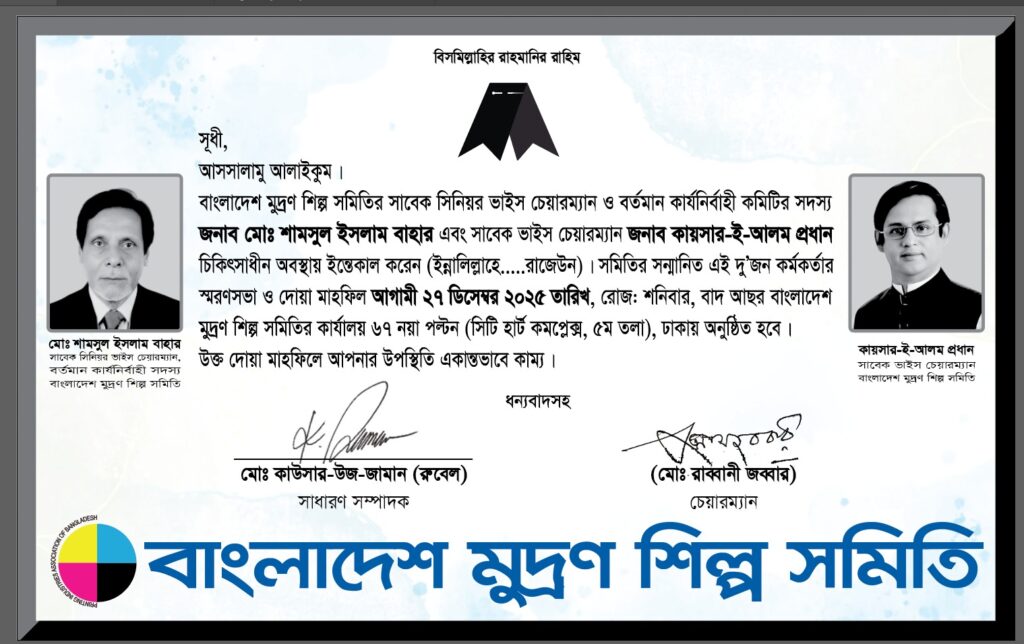 বাংলাদেশ মুদ্রণ শিল্প সমিতি (বামুশিস)-এর দুই গুণী ও শ্রদ্ধাভাজন নেতার স্মরণে বিশেষ দোয়া ও মিলাদ মাহফিলের আয়োজন করা হয়েছে। আগামী ২৭ ডিসেম্বর ২০২৫ শনিবার, বাদ আছর বামুশিস’র কার্যালয়ে সমিতির সাবেক সিনিয়র ভাইস চেয়ারম্যান ও বর্তমান কার্যনির্বাহী কমিটির সদস্য মরহুম মো:শামসুল ইসলাম বাহার এবং সাবেক ভাইস চেয়ারম্যান মরহুম কায়সার-ই-আলম প্রধান-এর স্মরণে এ অনুষ্ঠান অনুষ্ঠিত হবে।অনুষ্ঠানে মরহুম দুই নেতার রুহের মাগফিরাত কামনা করে বিশেষ দোয়া ও মিলাদ মাহফিল অনুষ্ঠিত হবে। একই সঙ্গে তাঁদের ব্যবসায়িক দক্ষতা,সাংগঠনিক অবদান এবং বাংলাদেশ মুদ্রণ শিল্প সমিতির আন্দোলন–সংগ্রামে তাঁদের